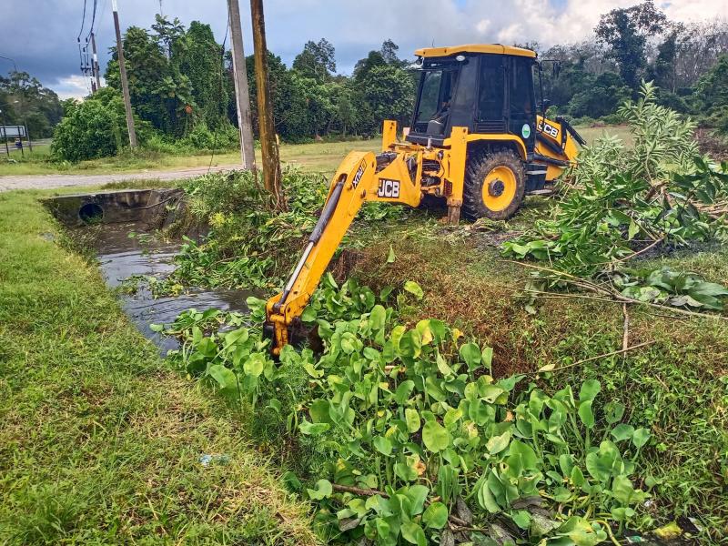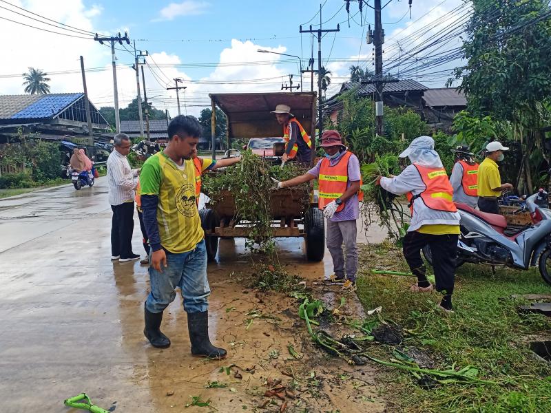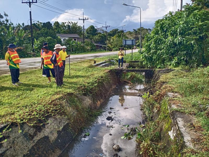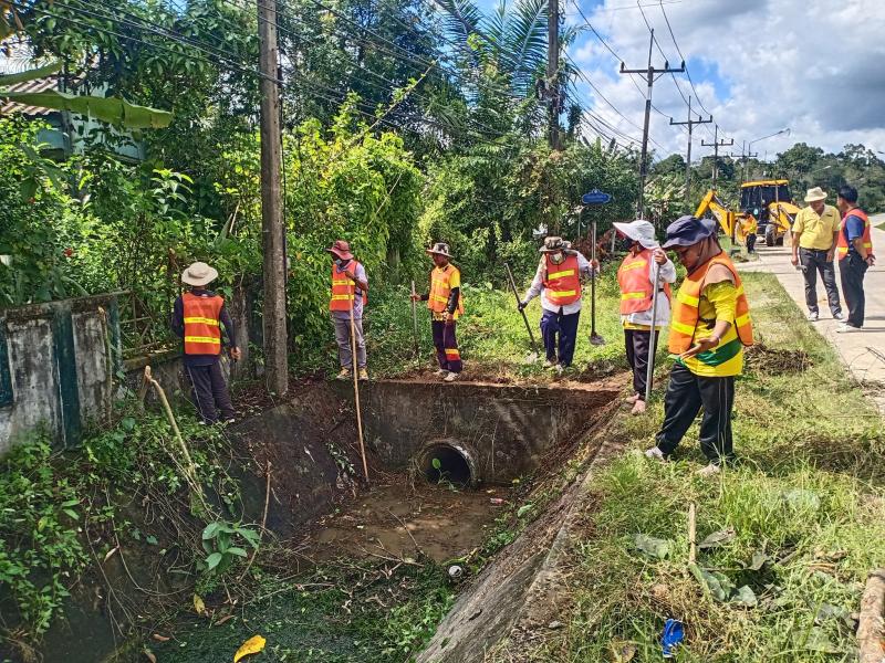 ขุดลอกคูระบายน้ำสองข้างถนน และกำจัดวัชพืช เพื่อเปิดทางระบายน้ำ ให้น้ำได้ไหลได้สะดวก ในบริเวณถนนจารุเสถียร ชุมชนต้นไม้สูง