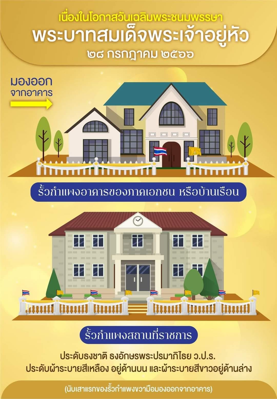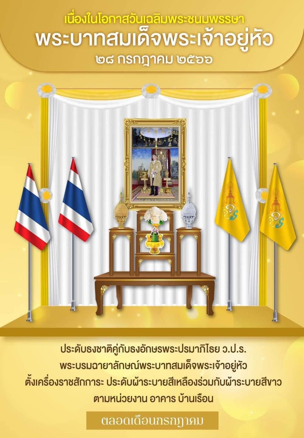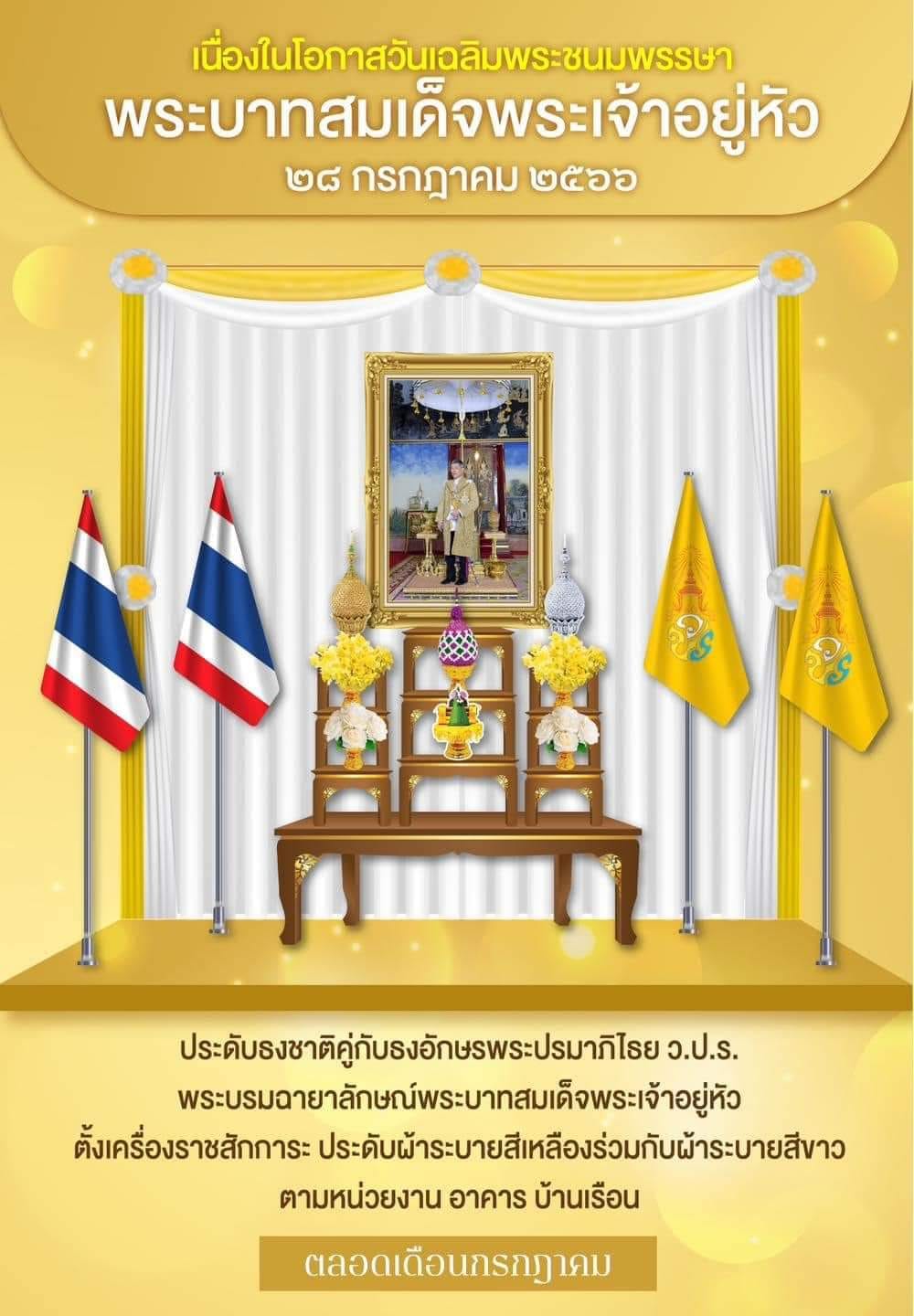 2.เชิญชวนบริษัท ห้างร้าน และประชาชนในพื้นที่ประดับพระบรมฉายาลักษณ์สมเด็จพระเจ้าอยู่หัว บริเวณด้านหน้าอาคารสำนักงานและที่พักอาศัย ประดับธงชาติไทยคู่กับธงอักษรพระปรมาภิไธย ว.ป.ร. ระหว่างวันที่ 1 - 31 กรกฎาคม 2566