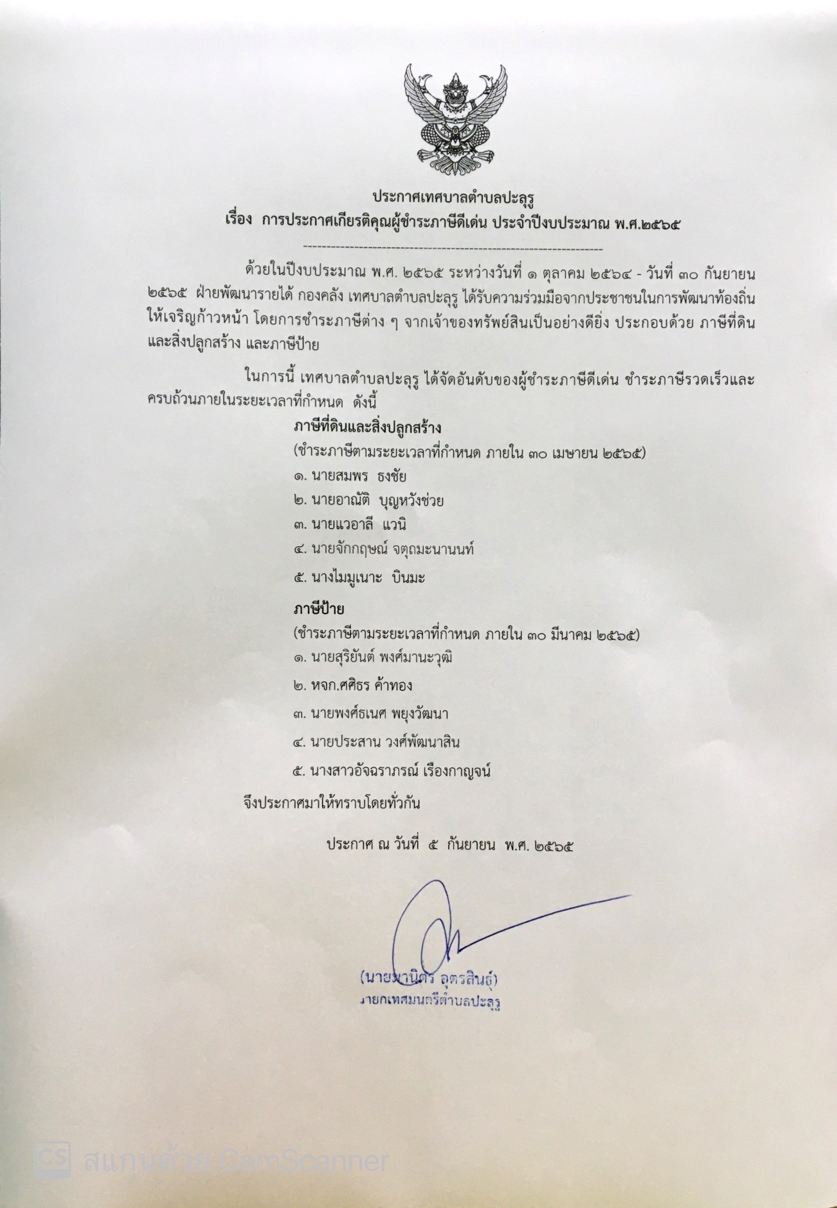 รายละเอียด : ประกาศเทศบาลตำบลปะลุรู เรื่อง การประกาศเกียรติคุณผู้ชำระภาษีดีเด่น ประจำปีงบประมาณ พ.ศ. ๒๕๖๕