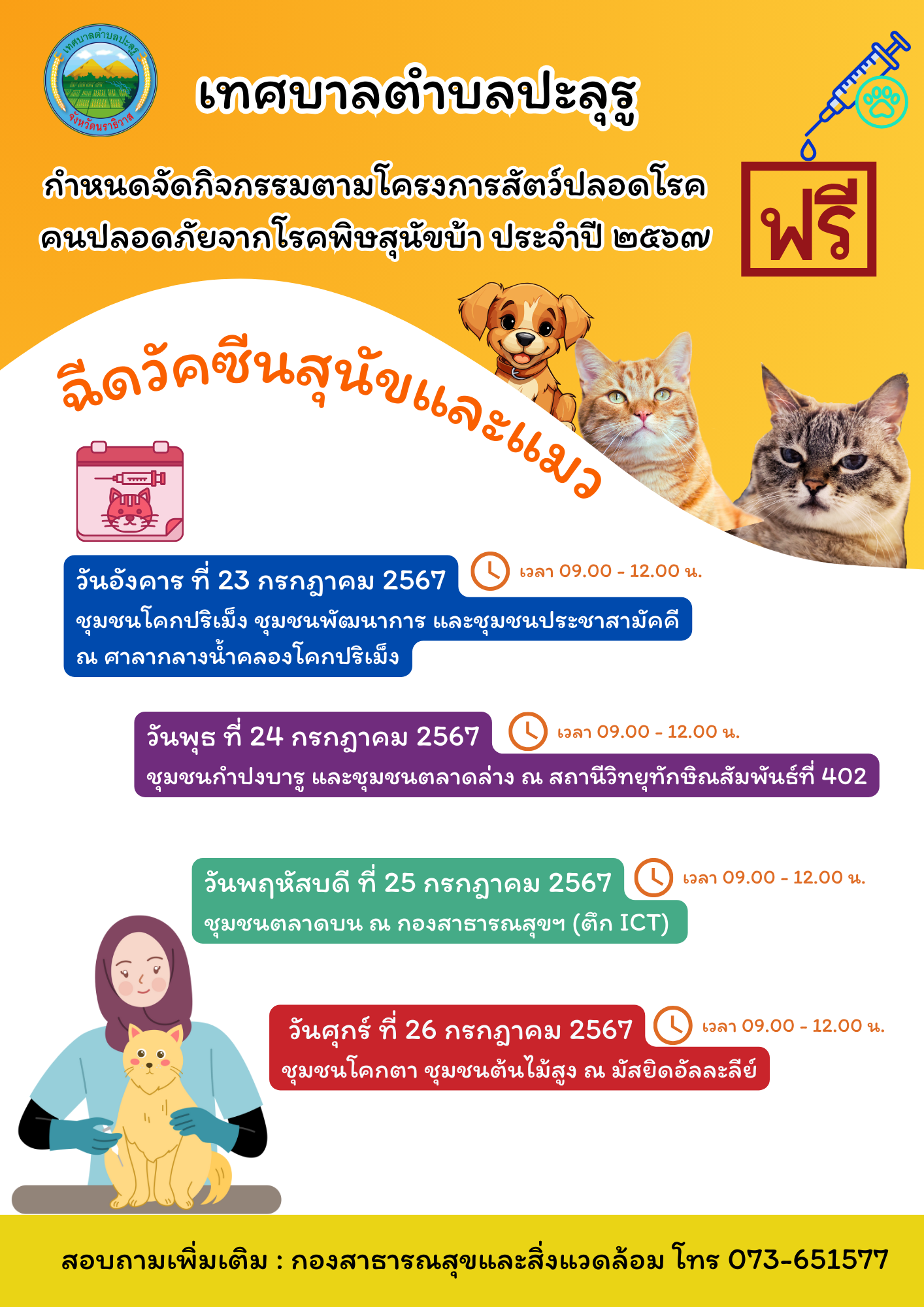 ชื่อเรื่อง : เทศบาลตำบลปะลุรู กำหนดจัดกิจกรรมตามโครงการสัตว์ปลอดโรค คนปลอดภัยจากโรคพิษสุนัขบ้า ประจำปี ๒๕๖๗