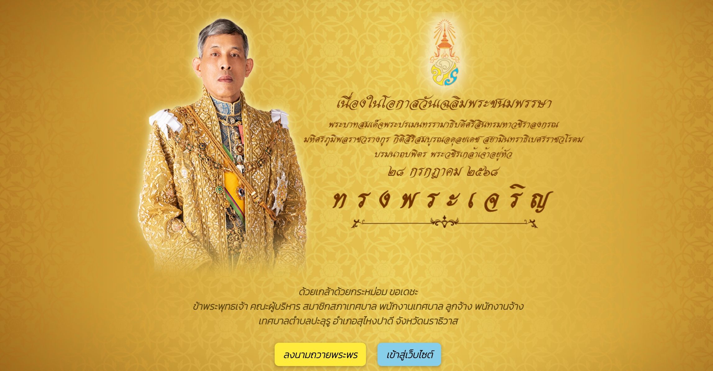 ชื่อเรื่อง : เทศบาลตำบลปะลุรู อ.สุไหงปาดี จ.นราธิวาส ขอเชิญชวนประชาชน ร่วมลงนามถวายพระพรชัยมงคล พระบาทสมเด็จพระเจ้าอยู่หัว เนื่องในโอกาสวันเฉลิมพระชนมพรรษา วันที่ 28 กรกฎาคม 2568 ผ่านระบบออนไลน์ที่หน้าเว็บไซต์เทศบาลตำบลปะลุรู
