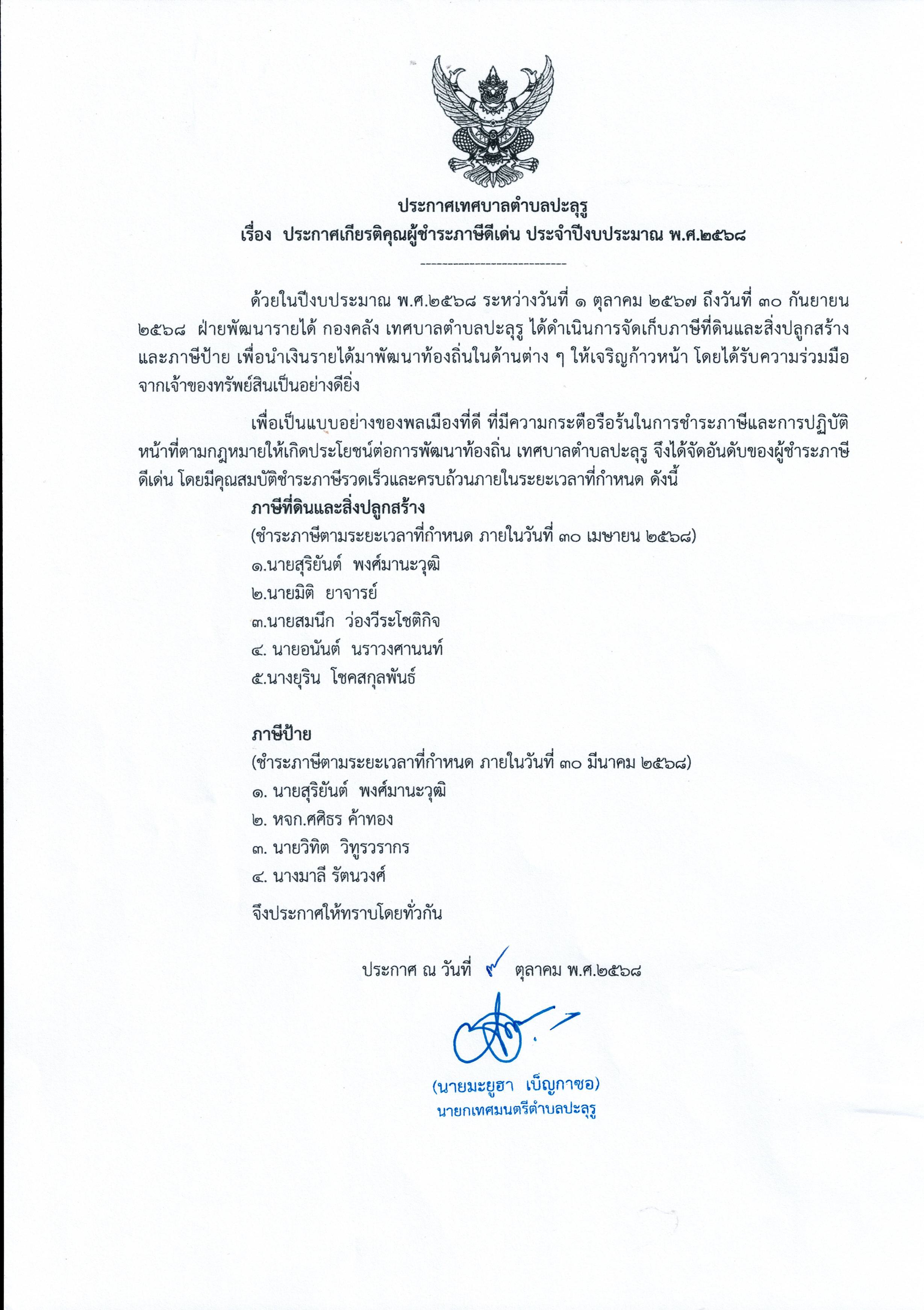 รายละเอียด : ประกาศเทศบาลตำบลปะลุรู เรื่อง ประกาศเกียรติคุณผู้ชำระภาษีดีเด่น ประจำปีงบประมาณ พ.ศ. 2568