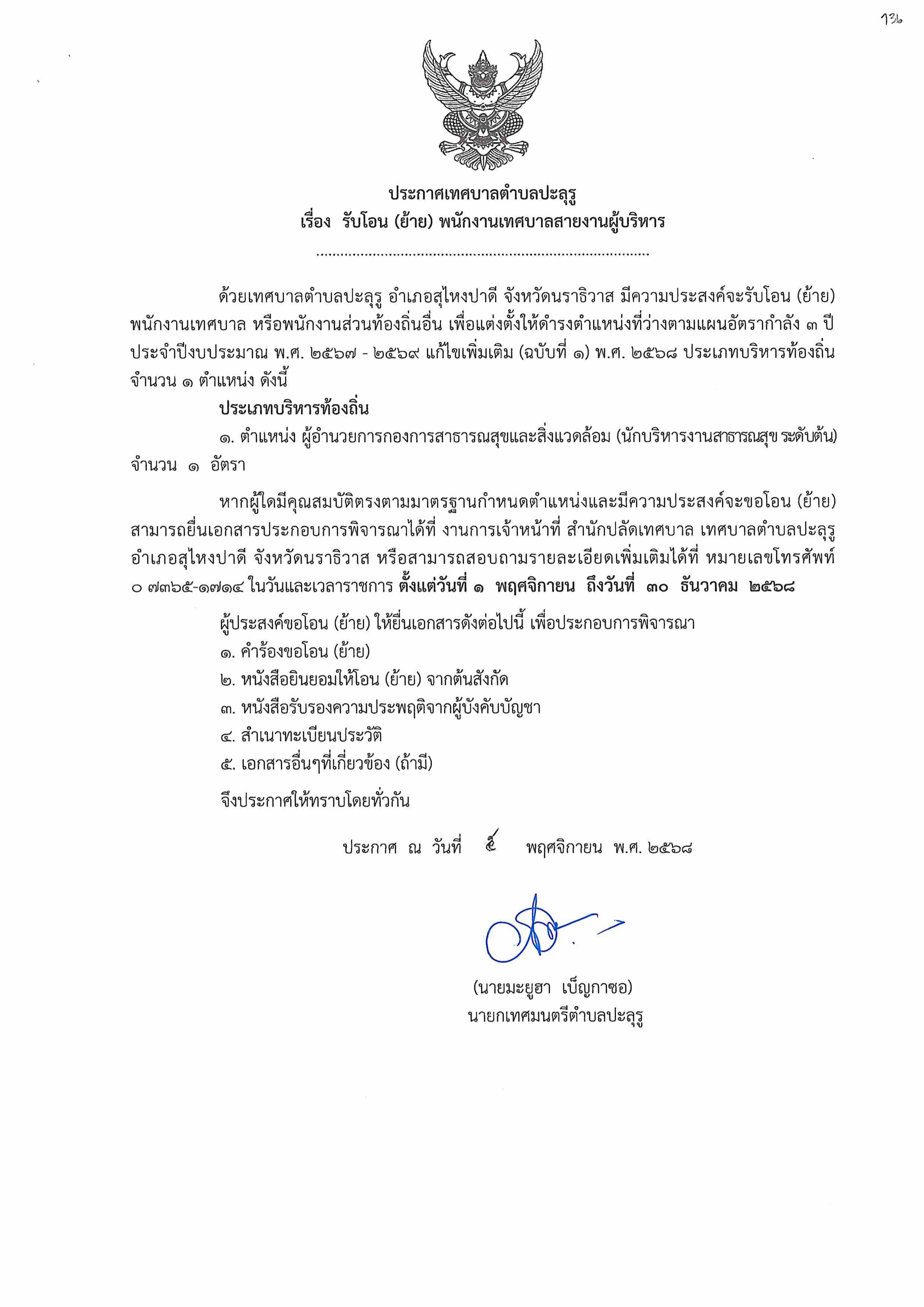 ชื่อเรื่อง : ประกาศเทศบาลตำบลปะลุรู เรื่อง รับโอน (ย้าย) พนักงานเทศบาลสายงานผู้บริหาร