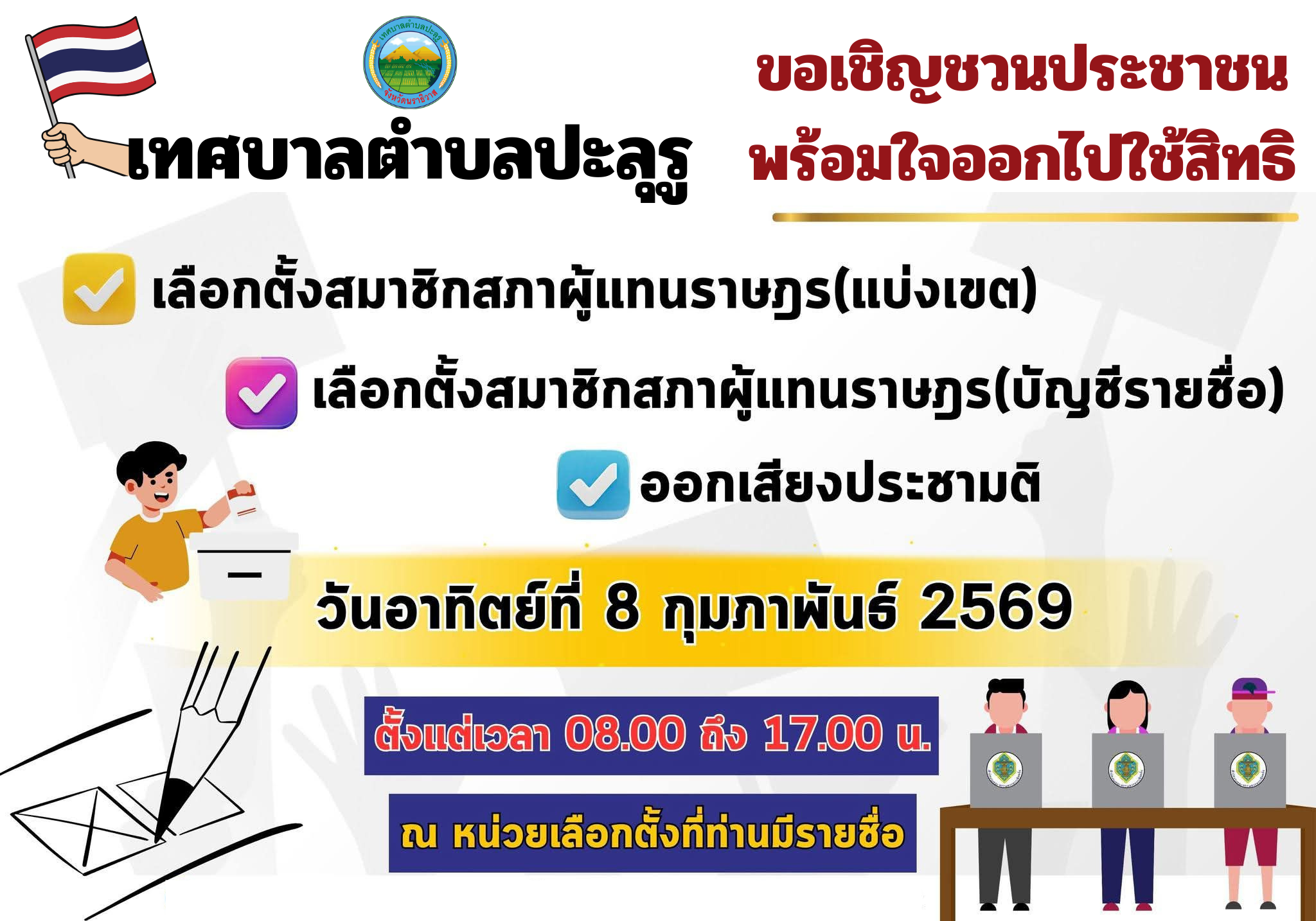 เทศบาลตำบลปะลุรู ขอเชิญชวนประชาชนผู้มีสิทธิเลือกตั้ง