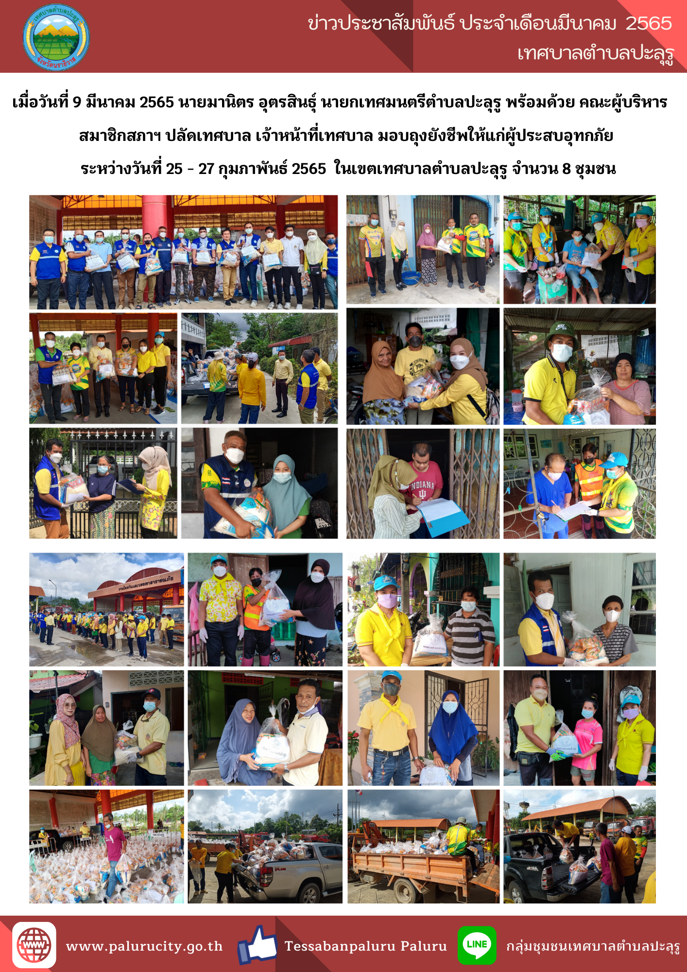 นายมานิตร อุตรสินธ์ุ นายกเทศมนตรีตำบลปะลุรู พร้อมด้วย คณะผู้บริหาร สมาชิกสภาฯ ปลัดเทศบาล เจ้าหน้าที่เทศบาล มอบถุงยังชีพให้แก่ผู้ประสบอุทกภัยระหว่างวันที่ 25 - 27 กุมภาพันธ์ 2565 ในเขตเทศบาลตำบลปะลุรู จำนวน 8 ชุมชน