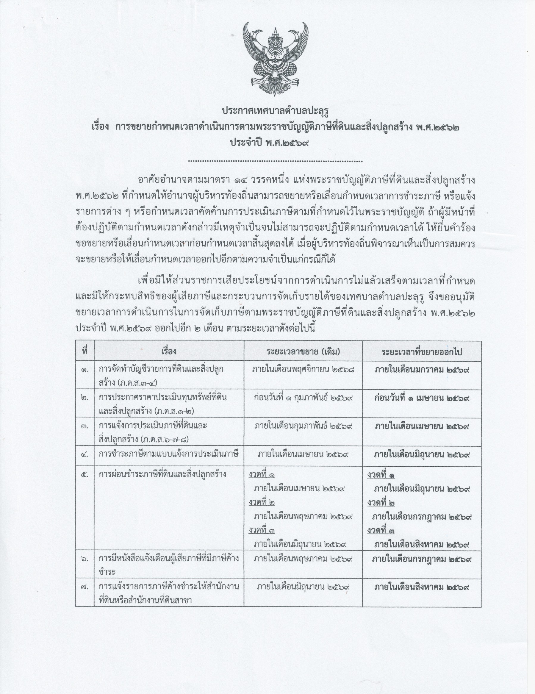 ประกาศเทศบาลตำบลปะลุรู เรื่อง การขยายกำหนดเวลาดำเนินการตามพระราชบัญญัติภาษีที่ดินและสิ่งปลูกสร้าง พ.ศ.๒๕๖๒ ประจำปี พ.ศ.๒๕๖๙