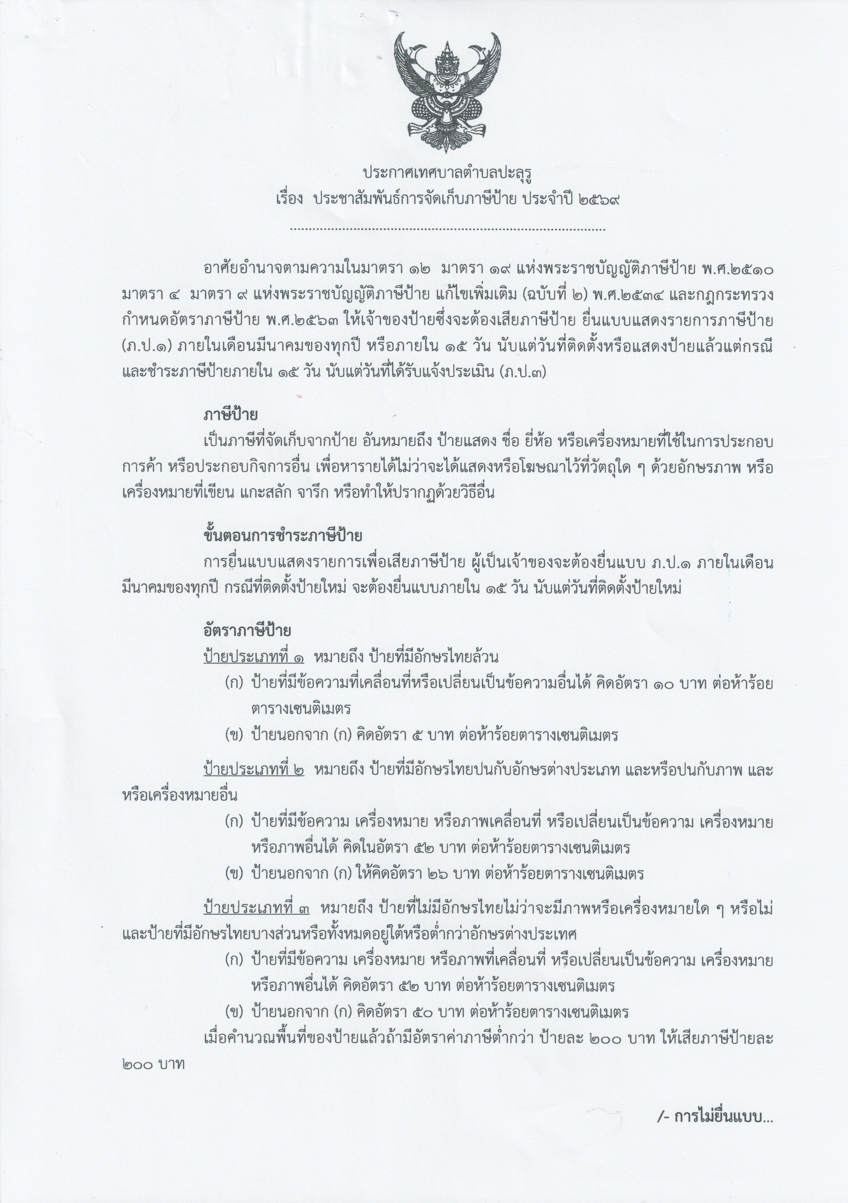 ประกาศเทศบาลตำบลปะลุรู เรื่อง ประชาสัมพันธ์การจัดเก็บภาษีป้าย ประจำปี ๒๕๖๙